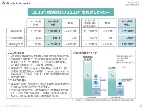 三菱商事決算発表 皆さん、こんにちは。 三菱商事が5月2日に2024年3月期の決算を発表しました。連結最終利益は前の期比18.4%減の9640億円になり、25年3月期も前期比1.5%減の9500億円に減る見通しとなりました。 直近の3カ月の実…