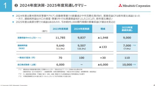 三菱商事決算発表 皆さん、こんにちは。 三菱商事が5月2日に2025年3月期の決算を発表しました。連結最終利益は前の期比1.4%減の9507億円になり、26年3月期も前期比26.4%減の7000億円に減る見通しとなりました。 直近の3カ月の実…