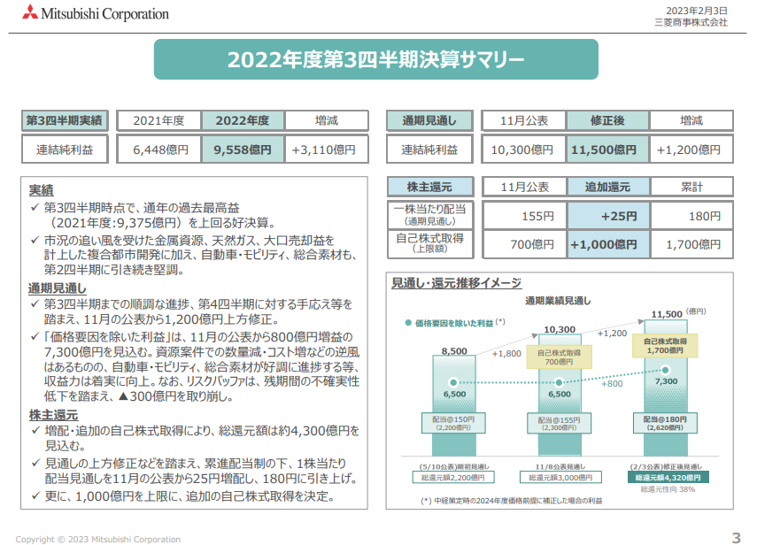 三菱商事が2月3日に2023年3月期第3四半期(4-12月)の決算を発表しました。連結最終利益は前年同期比48.2%増の9557億円に拡大しました。