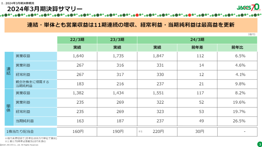 ジャックスが5月15日に24年3月期の決算を発表しました。連結経常利益は前の期比18.6%増の330億円に伸びました。25年3月期も前期比15.3%減の280億円に減る見通しとなりました。